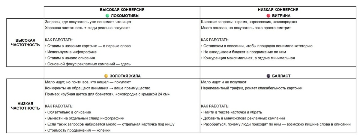Остальные 75 — либо бесполезны, либо мешают карточке расти. Карточка прекрасно продавалась, росла — и вдруг встала. Цены не меняли, товарные остатки на месте, конкуренты новые не появились, а роста нет. Знакомо? Или - другой кейс: показы есть - заказов продаж нет (загляните сейчас в воронку - уверена найдете десятки и сотни таких кандидатов) Причина часто проще, чем кажется: мир меняется, запросы покупателей меняются — а текст карточки остался прежним. Описание обновляется в лучшем случае раз в год. За это время покупатель начинает искать ваш товар другими словами — а вы этого не видите. Недавно увидела матрицу, которая помогает навести тут порядок ☝️(Спасибо конференции и Игорю Маньшину, практично и по делу) Все запросы, по которым покупатели находят ваш товар, делятся на 4 типа: 🔴 Витрина — «кроссовки», «крем для лица». Самые частотные. Но покупатель по такому запросу ещё не выбрал — он просто смотрит. Конкуренция максимальная, конверсия минимальная. Нужны только чтобы площад
