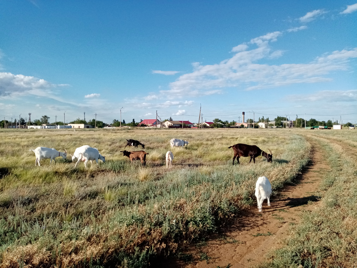 За время моего молчания у нас появилась коза, а потом ещё одна, а потом мы не заметили, как наше стадо разрослось до 15 коз. Теперь мы с ними гуляем по бескрайней степи и наслаждаемся небом и закатами.