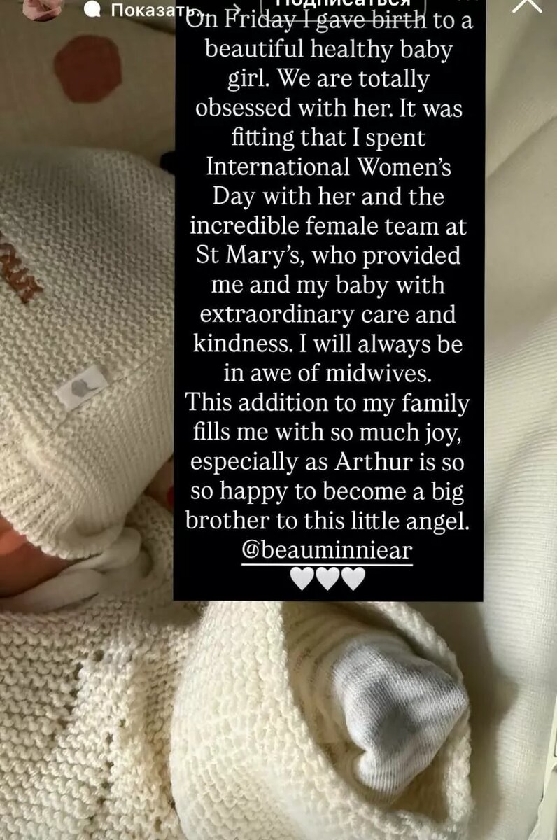 У британской поп-дивы уже есть 4-летний сын от бывшего мужа Каспара Джоплинга. hellomagrussia.ru 39-летняя Элли Голдинг 6 марта во второй раз стала мамой, но сообщила об этом только сейчас, сразу же рассекретив пол новорожденной. Для них с бойфрендом Бо Минниром это первый общий ребенок, но для Элли — уже второй, после сына Артура, которого она родила в 2021-м от экс-супруга Каспара Джоплинга. В радостной сторис, где знакомит подписчиков с девочкой, Голдинг рассказала, что Международный женский день провела в роддоме, и праздник стал для нее по-настоящему особенным. В эту пятницу у меня родилась прекрасная здоровая девочка. Мы просто без ума от нее, - написала певица. - Очень символично, что Международный женский день я провела с ней и с невероятной женской командой в больнице Святой Марии, которая окружила нас с малышкой невероятной заботой и добротой. Прибавление в нашей семье наполняет меня невероятной радостью, особенно потому, что Артур очень рад стать старшим братом этого маленьк