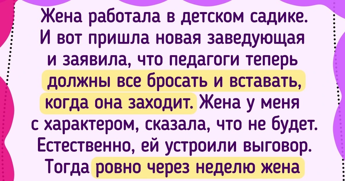 Жена работала в детском садике. И вот пришла новая заведующая и заявила, что педагоги теперь должны все бросать и вставать, когда она заходит. Жена у меня с характером, сказала, что не будет. Естественно, ей устроили выговор. Тогда ровно через неделю жена написала заявление по собственному желанию и ушла в другой сад. © balabasishe / Pikabu