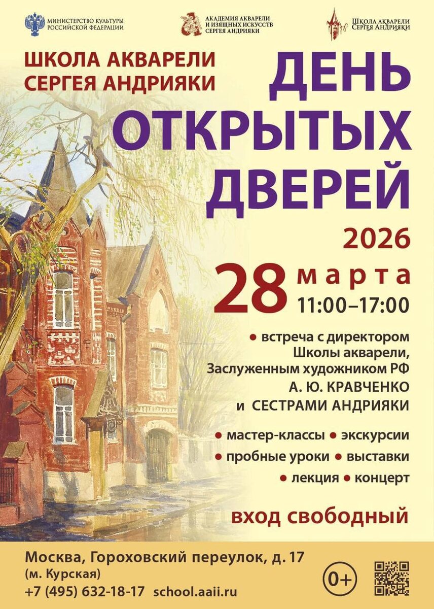 🗓️28 марта с 11:00 до 17:00 📍Гороховский пер., 17 (м. Курская) В этот день будущих учеников подробно познакомят с программой обучения, педагоги наглядно продемонстрируют уникальность авторской методики, все желающие смогут принять участие в пробных уроках и создать свою, возможно, первую в жизни акварель. В программе мероприятия: 🔸Встреча гостей с директором Школы акварели, Заслуженным художником РФ А.Ю. Кравченко и СЕСТРАМИ АНДРИЯКИ; 🔸мастер-классы; 🔸пробные уроки; 🔸экскурсии; 🔸выставки; 🔸концерт; 🔸лекция; 🔸выставки. 🔶18 апреля с 11.00 до 17.00 - День открытых дверей в Академии акварели и изящных искусств Сергея Андрияки (Ул. Академика Варги, 15). 🆓Бесплатно Подробнее ЗДЕСЬ 👨👩👧👦 @togetherwithkids Пост носит информационный характер Поддержать канал голосом ЗДЕСЬ 📲МАХ/ 📱ВК