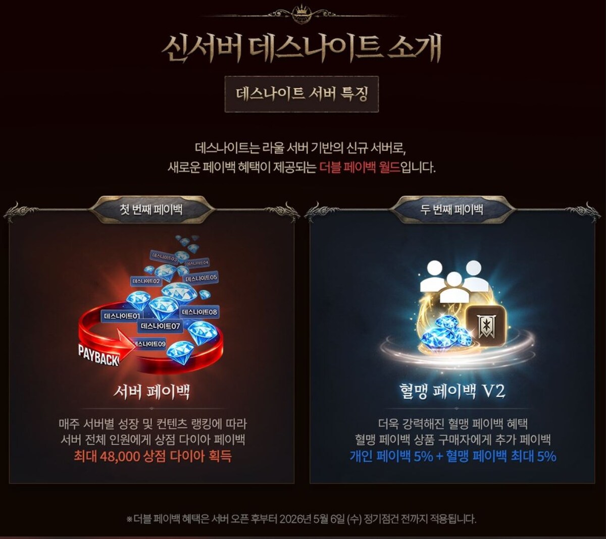 25 марта на Корее открывается новый кластер серверов Death Knight / Рыцарь Смерти. https://lineage2m.plaync.com/board/cm_story/view?articleId=69c34fb0091d780badf85cdc Особые преимущества, доступные только на сервере Death Knight: кэшбэк сервера и усиленный кэшбэк клана! Кэшбэк сервера Еженедельно, в зависимости от рейтинга роста и активности на сервере, все игроки сервера получают кэшбэк в магазинных алмазов. Максимально можно получить 48 000 магазинных алмазов. Кэшбэк клана Усиленные преимущества кэшбэка клана. Дополнительный кэшбэк для покупателей товаров кэшбэка клана: 5% личного кэшбэка + до 5% кэшбэка клана. Дорожная карта. В анонсе представлена дорожная карта по контенту Эльмора, подземелий Арены и мастер подземелий с информацией, что они будут обновлены/добавлены в будущем. Из интересного, после картинки Мастер Арены Святилище Гипериона следующей картинкой идет Башня Испытаний. Кэшбэк сервера Рейтинг серверов Death Knight с 1-го по 10-й будет определяться в соответствии с к