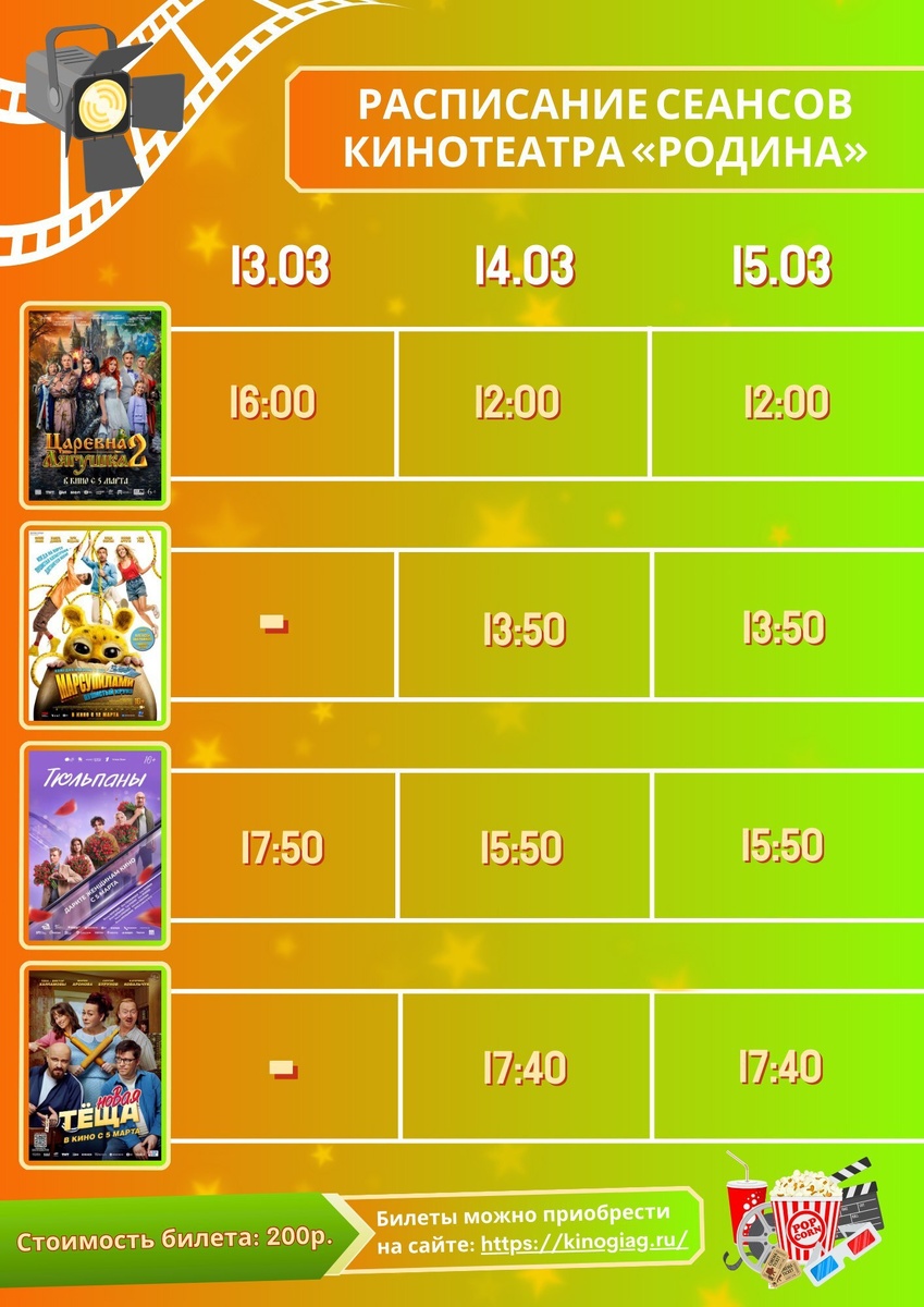 Расписание сеансов кинотеатра "Родина" с 13 по 15 марта