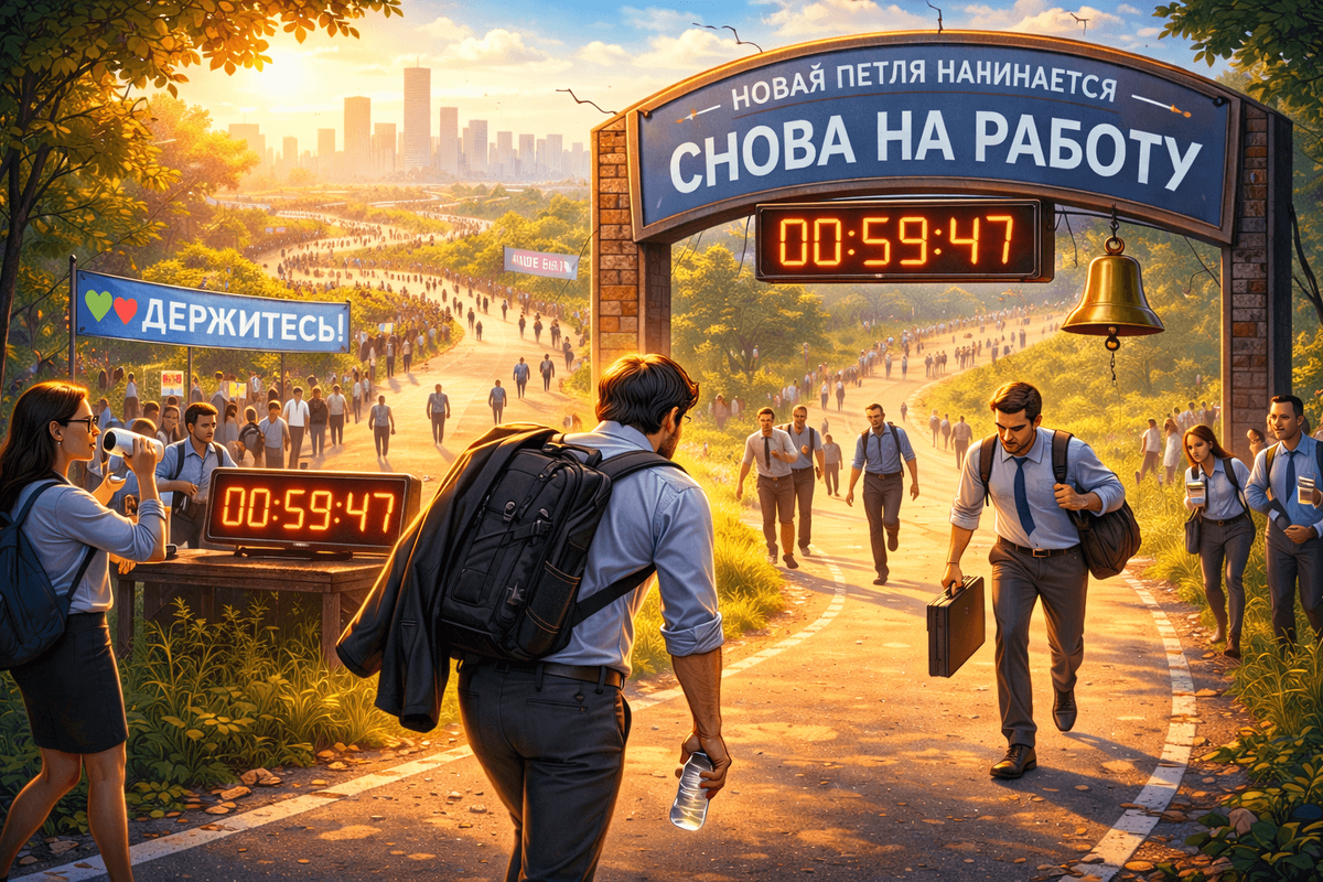 Михаил Соломонов вчера напомнил о существовании Backyard Ultra — бегового формата, который выглядит как плод воображения садиста, но на деле является точнейшей метафорой социального выживания. Суть проста: ты бежишь круг в 6,7 км строго за час. Прибежал быстрее — сиди жди следующего гудка. Не вышел на старт нового круга — выбыл. Победитель один, остальные — неудачники (DNF). Автор справедливо проводит параллель с «Долгой прогулкой» Стивена Кинга, где подростки идут по шоссе со скоростью 4 мили в час, пока не умрут все, кроме последнего. Но если присмотреться к структуре корпоративного быта или циклу жизни «от зарплаты до зарплаты», становится ясно: мы все уже давно на этой трассе. Только вместо Лазаруса Лейка у нас банковский скоринг, а вместо судей с винтовками — отдел кадров и уведомления от налоговой. В Backyard Ultra дистанция круга рассчитана математически: за сутки ты пробегаешь ровно 100 миль. Это идеальный цикл. В обычной жизни этот цикл — календарный месяц. Ваша зарплата — это