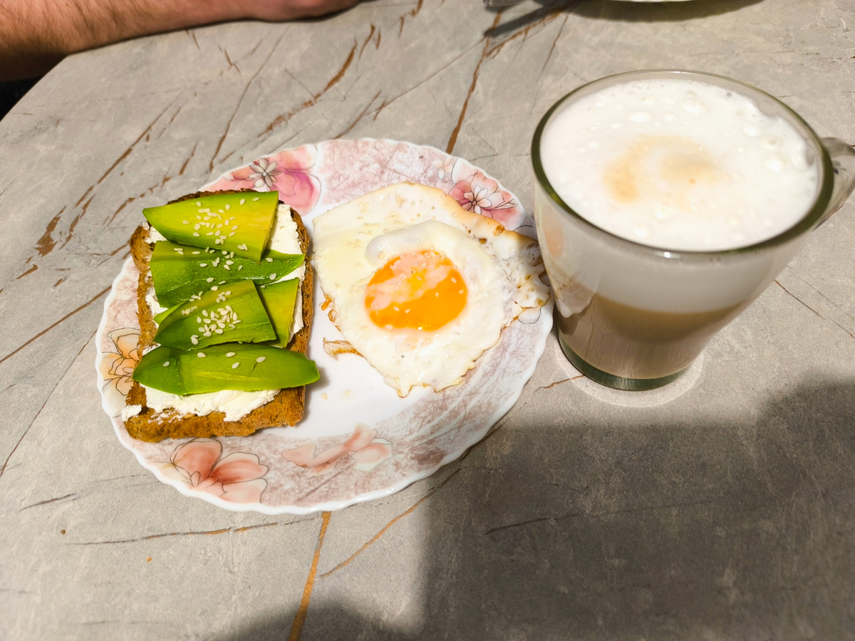 Яичница, тост с творожным сыром+авокадо+кунжут. Кофе молотый со сливками .