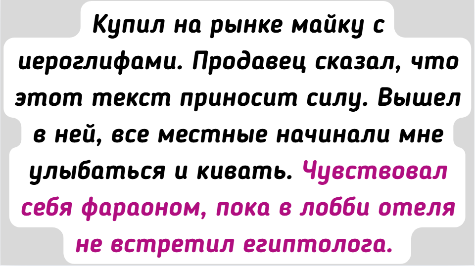- Купил на рынке майку с иероглифами. Продавец сказал, что этот текст приносит силу. Вышел в ней, все местные начинали мне улыбаться и кивать. Чувствовал себя фараоном, пока в лобби отеля не встретил египтолога. Он поглядел на майку, протер очки и выдал: «Молодой человек, у вас тут очень каллиграфично написан древний рецепт чечевичной похлебки с чесноком. Видимо, местные просто очень любят поесть».