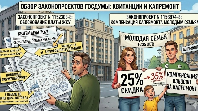 Пробежимся по законопроектам, которые недавно внесли в Госдуму: 1) предлагается в квитанции за ЖКУ обосновывать повышение платы, если такое было по сравнению с аналогичным месяцем прошлого года (Проект Федерального закона № 1152303-8). Очень плохо написанный проект закона. Во-первых, почему-то требование установлено только для коммунальных услуг. Во-вторых, изменение платы за коммунальные услуги зависит от тарифов, а сообщать об изменении тарифов и так должны. В-третьих, а если (и это наверняка так и будет) размер платы меняется просто из-за увеличившегося или уменьшившегося потребления? Короче, проект совсем нежизнеспособный. И это я еще молчу про формулировку, что объяснение должно "содержать понятные для граждан формулировки в объеме не более двух листов в формате А4". Кто определяет понятность? И почему два листа? ; Ставьте лайки и подписывайтесь на наш блог "ЖКХ: вопросы и ответы" в Дзене. Этой полезной ссылкой вы можете поделиться с друзьями, родственниками или с соседями в домов
