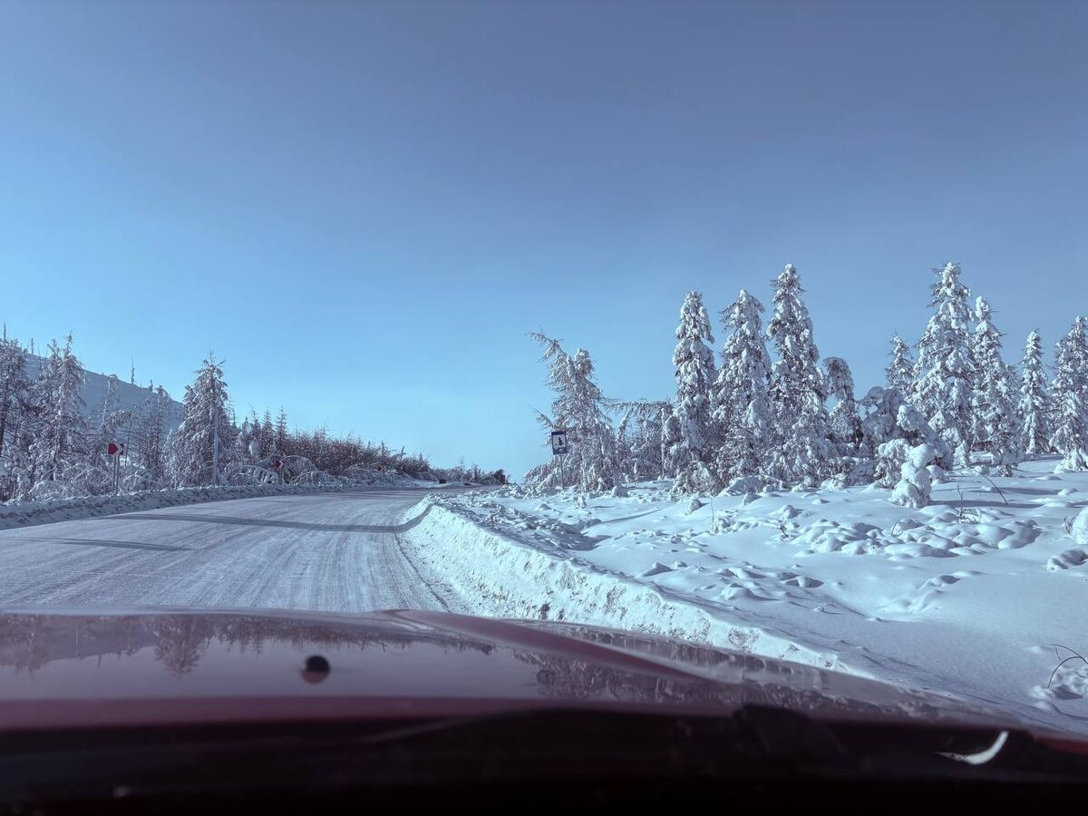 Усть-Нера – Хандыга. 6 марта. Самое унылое – когда путешествие вроде как закончилось. Но нельзя просто взять, сесть на самолёт и улететь домой. До самолёта надо ещё выбираться по дороге, по которой уже езжено-переезжено. И чтобы путники уж совсем в уныние не впадали, дорога напоследок прощается видами гор, встающих во весь горизонт. Уже к вечеру горы закончатся, и до Якутска от Хандыги будет совсем ничем не примечательная дорога. Но это будет завтра. В этот же день у нас были снежные горы, странные собаки с человеческими лицами, кафе, хозяйка которого копит на оленя (с уточнением – живого). И Хандыга с её знаменитой летающей тарелкой. Я же по традиции (два раза – это же традиция?) пользуясь относительно тёплой погодой (всего-то -18) и свободным временем, перед закатом немного пробежалась по посёлку и реке Алдан. В наступающих сумерках какая-то компания на реке пыталась запустить воздушного змея. Змей не запускался, потому что на их несчастье и на моё счастье не было в