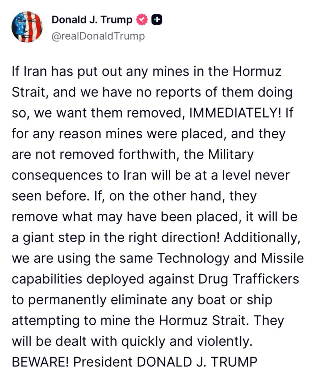 «Если Иран разместил мины в Ормузском проливе, а у нас нет сообщений о том, что они это сделали, мы хотим, чтобы их убрали, НЕМЕДЛЕННО! Если по какой-либо причине мины были установлены, и они не будут немедленно удалены, военные последствия для Ирана будут на уровне, которого никогда не было. Если же они уберут то, что могло быть размещено, это будет огромным шагом в правильном направлении!» – заявил он. ❗️Ранее корреспондент CBS News при Белом доме Дженнифер Джейкобс сообщила о том, Иран начал минировать Ормузский пролив: «Разведка США начала выявлять признаки того, что Иран предпринимает шаги по установке мин на морских путях Ормузского пролива. Иран использует небольшие суда, каждое из которых может нести от двух до трех мин. Хотя запасы мин в Иране публично неизвестны, оценки за прошедшие годы варьировались примерно от двух до шести тысяч морских мин», — написала она. Подписаться: За Брата 🇷🇺