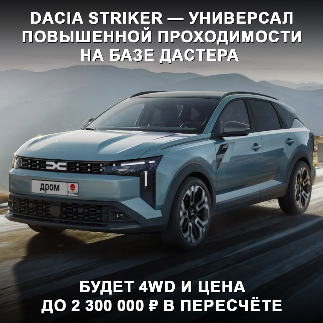 Цена в Европе в пересчёте — дешевле 2 300 000 ₽ 👀 У автомобиля увеличенный дорожный просвет, пластиковая защита по периметру и множество рельефных поверхностей. Длина Striker — 4,62 м. Силовой агрегат, по слухам, — это турбомотор 1,2 л с электромотором на задней оси с суммарной отдачей 154 л.с. А дизайн интерьера повторяет салоны Duster и Bigster. Ближайшим конкурентом новинки в Европе станет Skoda Octavia Combi. Но Dacia дешевле, её цена не превысит €25 000 (2 300 000 ₽). Старт продаж — это лето. Как вам такой внук Дастера? 🤔 #дромновость #румыния #dacia #striker #универсал