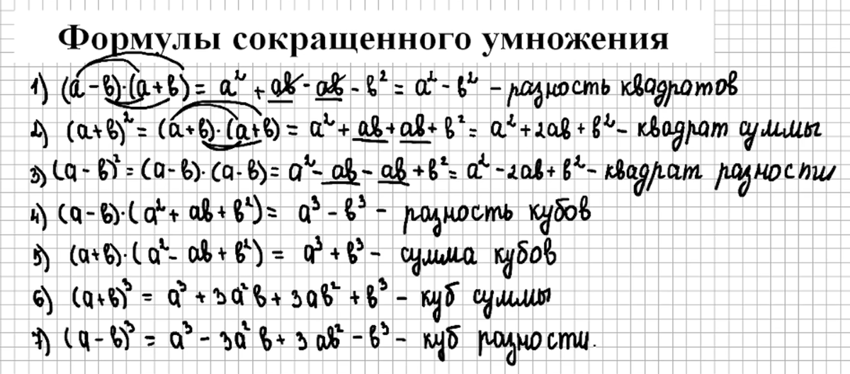 Формулы сокращённого умножения (ФСУ) многочленов — это тождества, которые помогают упростить вычисления при возведении в степень и умножении выражений. Они позволяют: Изучаются в 7 классе по алгебре. Ниже приведены некоторые формулы сокращённого умножения для разных случаев: квадрата суммы, квадрата разности, разности квадратов и куба суммы. Оформляйте подписку на канал и сможете смотреть подробные видео разборы различных тем по математике. см.ниже по ссылке Как запомнить????? Формулы сокращенного умножения (АЛГЕБРА, 7 класс) Как применять??? Формулы сокращенного умножения (АЛГЕБРА 7 класс) Разложение многочлена на множители с помощью ФСУ (АЛГЕБРА, 7 класс)