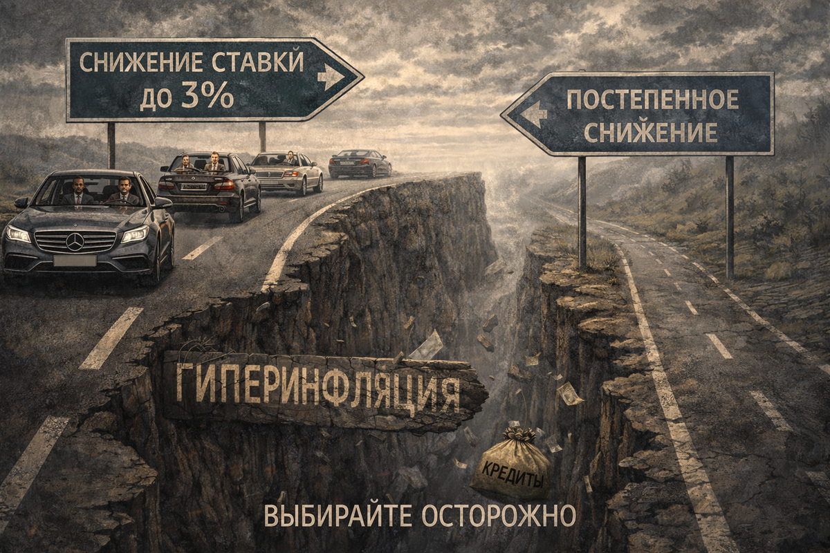 Олег Дерипаска и некоторые депутаты Госдумы предлагают чудо-рецепт: резко уронить ключевую ставку до 3% — и экономика поскачет. ЦБ в ответ смоделировал сценарий и выдал результат: первые пару лет будет кайф, а потом всё рухнет в гиперинфляцию и рецессию. Бизнесмены хотят дешёвых денег здесь и сейчас. ЦБ считает, что дешёвые деньги без оглядки на инфляцию — это путь в никуда. Давайте разбираться, кто прав и чем на самом деле грозит резкое смягчение денежно-кредитной политики. Сейчас ключевая ставка — 15,5% . Это результат последовательного снижения с пика в 21% в середине 2025 года . Бизнес и часть политиков требуют ещё большего смягчения — вплоть до 3%. Логика простая: дешёвые кредиты разгонят инвестиции, вырастет производство, все будут счастливы . Центробанк к таким резким движениям относится как к предложению прыгнуть с крыши — вроде сначала полетишь, а потом встретишься с асфальтом. Чтобы доказать это наглядно, регулятор смоделировал ситуацию и представил расчёты . В исследовании Б
