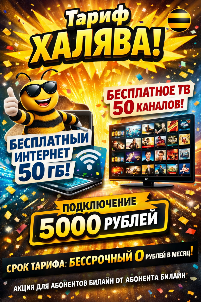 В эпоху цифровых технологий доступ к высокоскоростному интернету и качественному телевидению является неотъемлемой частью повседневной жизни каждого абонента. Компания Билайн предлагает уникальное решение — тариф Халява тариф Халява, обеспечивающее максимум выгоды максимум выгоды без регулярных расходов. По условиям предложения абоненты получают бесплатный интернет бесплатный интернет объёмом 50 ГБ 50 ГБ, а также бесплатное телевидение бесплатное телевидение с пакетом 50 каналов 50 каналов. Подключение подключение осуществляется за 5000 рублей 5000 рублей. После активации тариф становится бессрочным бессрочный с абонентской платой 0 рублей в месяц 0 рублей в месяц. Данное выгодное предложение выгодное предложение реализуется в рамках акции Билайн акция Билайн исключительно для абонентов Билайн для абонентов Билайн от абонента Билайн. Это специальное предложение специальное предложение позволяет добиться существенной экономии на услугах связи экономии на услугах связи. Желающим подключи