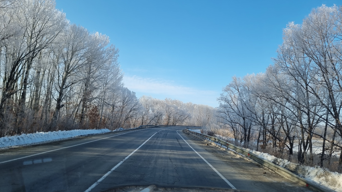 Дорога к месту назначения пролегала по трассе Р-297 «Амур» (Хабаровск — Чита). Вся трасса была одета в серебро инея.