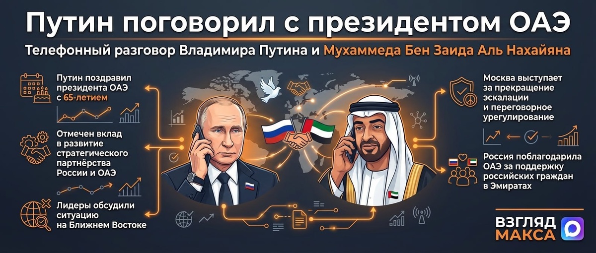 В ходе беседы российский лидер поздравил своего эмиратского коллегу с 65-летием, а также стороны обсудили ситуацию на Ближнем Востоке и текущее состояние двусторонних отношений. Владимир Путин тепло поздравил Мухаммеда Бен Заида Аль Нахайяна с юбилеем, пожелал ему крепкого здоровья, благополучия и дальнейших успехов. При этом он отдельно отметил его большой личный вклад в развитие стратегического партнёрства между Россией и Объединёнными Арабскими Эмиратами. С обеих сторон было с удовлетворением констатировано, что дружественные российско-эмиратские отношения динамично развиваются по всем направлениям. Отдельное внимание в разговоре было уделено опасно деградирующей ситуации на Ближнем Востоке, которая, как подчёркивается, уже оборачивается тяжёлыми последствиями не только для Ирана, но и для арабских стран. В этом контексте Владимир Путин подчеркнул необходимость скорейшего прекращения дальнейшей эскалации и урегулирования конфликта путём переговоров. Кроме того, президент России в