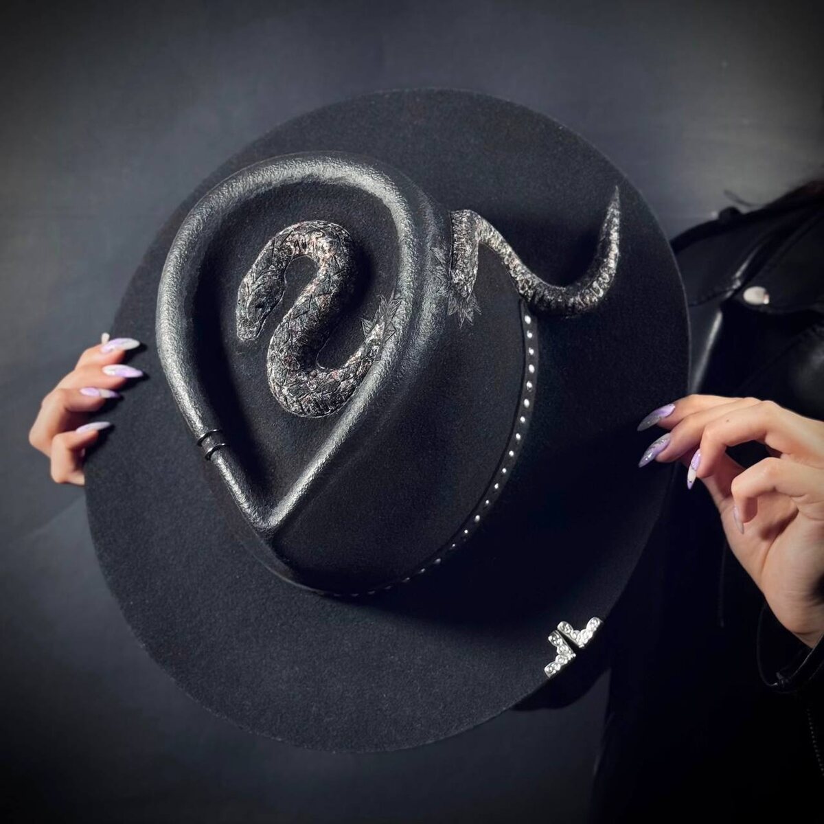 Федора «Змея» Чёрная фетровая шляпа с рельефом змеи, которая обвивает тулью. Рельеф объёмный — формуем змею из фетра: тело, изгибы, голову. Затем проходим выжигателем: прорисовываем контур, каждую чешуйку и линию. Дальше наносим краску — серая с тёплым коричневым отливом, чтобы змея ожила и заиграла. Глаза выделяем двумя чёрными стразами — они переливаются на свету и будто следят за движением. Дополнили декор чёрной картой пики и металлической вставкой на полях. Каждый раз змея получается разной — со своим рисунком, оттенком и характером. Потому что ручная работа не терпит копий. Заказать или просто спросить:)