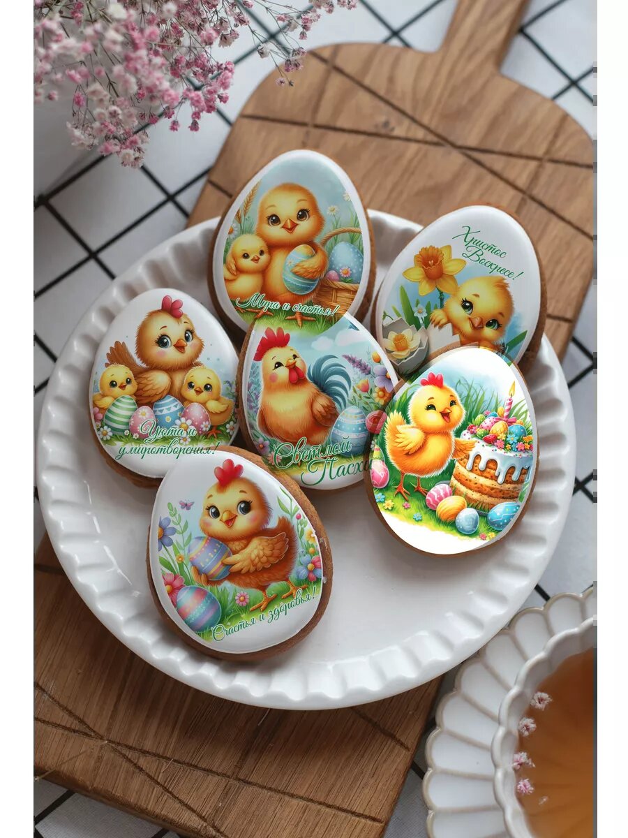 Набор из шести расписных медово-имбирных пряников — готовый пасхальный подарок и украшение в одном. Каждый пряник покрыт глазурью из сахарной пудры и куриного белка, упакован индивидуально в пакет и пузырчатую плёнку, весь набор — в картонную коробку. В пряниках предусмотрены отверстия для палочек, которые входят в комплект.