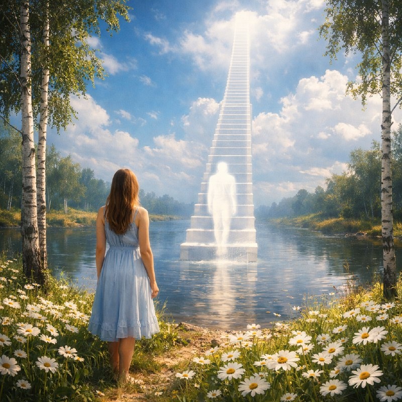 Небо пронзительной синевы. Небольшие облачка медленно текут, меняясь формами рыб и зверей. Из реки ввысь возвышается высокая, очень высокая, до самых облаков, лестница, по которой медленными шагами поднимаются люди. Их бесконечное множество. Она стоит на берегу и не знает, как по воде дойти до этой лестницы, явно понимая, что ей надо туда. Рядом появился Глеб. Она получает огромное удовольствие, эйфорию рядом с ним. Хочется взять его за руку и очутиться на той великолепной лестнице, идущей в тайный, чудный мир, к чистым серебристым облакам. Но их разделяет прозрачная стена. Его мысли говорят ей, что он не может взять её с собой, ещё не время. Она утратила цель и смысл жизни, а это надо исправить. Глеб уходит прямо по воде и встаёт на первую ступеньку лестницы, оглядываясь на Милу.
