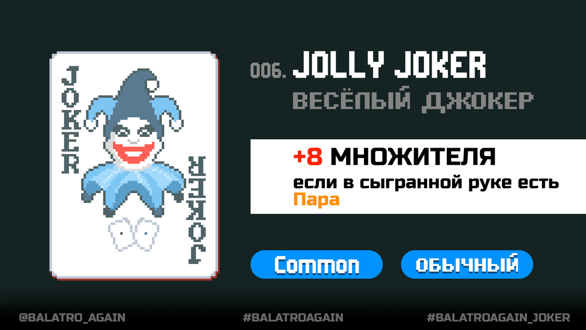 #jokers Весёлый джокер (Jolly Joker) — простой джокер, дающий незамысловатый стабильный множитель +8 за любую руку, в которой есть пара. Вообще корректнее было бы стазать за любую руку, кроме Старшей карты, ведь при определенных махинациях с джокерами, он может работать и на стритах, и на флэшах, и на стрит-флэшах (например джокер 4 пальца в помощь). Из преимуществ: +8 множителя в начале игры вообще будут не лишним, ведь комбинации с парами собираются легко. Из минусов: к концу игры джокер становится сильно бесполезным, ведь его +8 мульта будут как капля в море. ✔️ Хитрый джокер. Даёт +50 фишек за комбинацию с парой. Чего бы им не синергировать. ✔️ Дуо. Этот джокер даёт x2 множителя за комбинации с парой. Сильно полезная история. ✔️ Полуджокер. А этот товарищ и вообще даст +20 множителя, НО в случае если играются не более 3 карт за раз. Так что тут джокер в помощь в случае исключительно сетов и пар, на каре бесполезен. Но, опять таки, для начала игры вообще супер. Таким образом, начина
