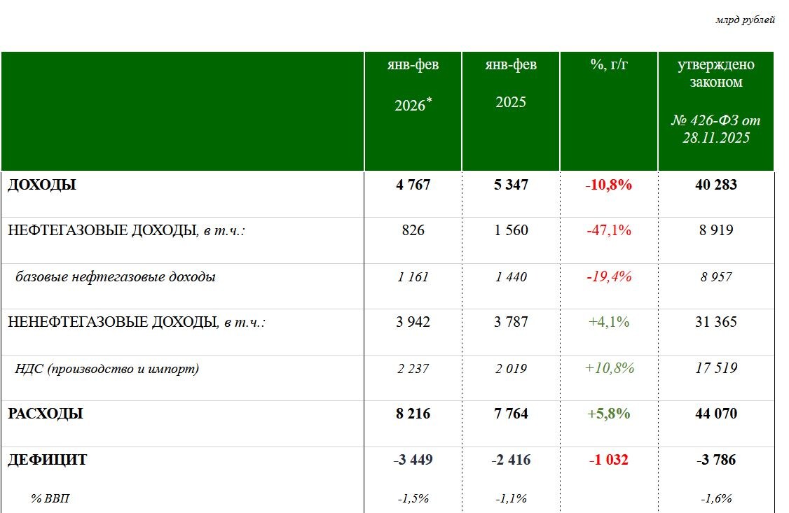 Инфляция помогла, нефть подкосила, а военные расходы, по-прежнему, главный приоритет Доходы за январь-февраль упали на 10,8% к тому же периоду прошлого года. И это номинально, без учета инфляции. В реальном исчислении — еще больше. Нефтегазовые — в полном провале, их вдвое меньше, чем в прошлом году. Ненефтегазовые — слегка подросли (+4,1%), но это за счет инфляции. Самый инфляционный налог — НДС вырос на 11%. Это существенно выше официальных показателей инфляции, но ниже альтернативных оценок (15%). Если ориентироваться на последние — это означает фактический спад производства в стране. Несмотря на провал доходов, расходы сокращать никто не дал, они выросли на 5,8%. Военное производство надо авансировать, а то и оно просто остановится. Итог — рекордный дефицит 3,45 трлн.р. ( 1,72 трлн в январе, 1,73 трлн в феврале) Выше прошлогоднего за эти же 2 месяца на триллион. В марте ситуация улучшится — нефтегазовые доходы вырастут, благодаря войне Трампа в Иране, а расходы сократятся (авансы у