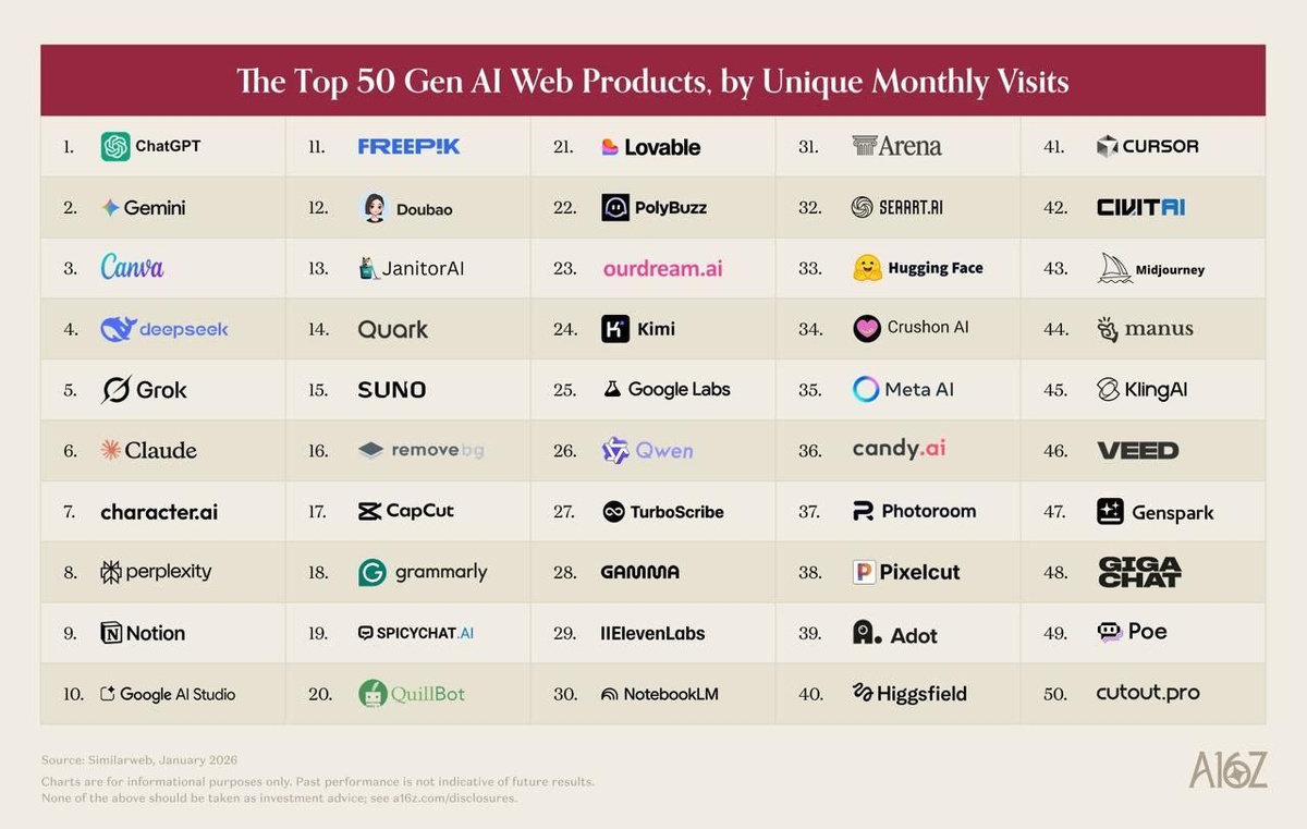 ⚡️️️️ ГигаЧат от Сбера залетел в топ-5️⃣0️⃣ мировых веб-сервисов на базе ИИ — американский венчурный фонд Andreessen Horowitz (a16z) выкатил