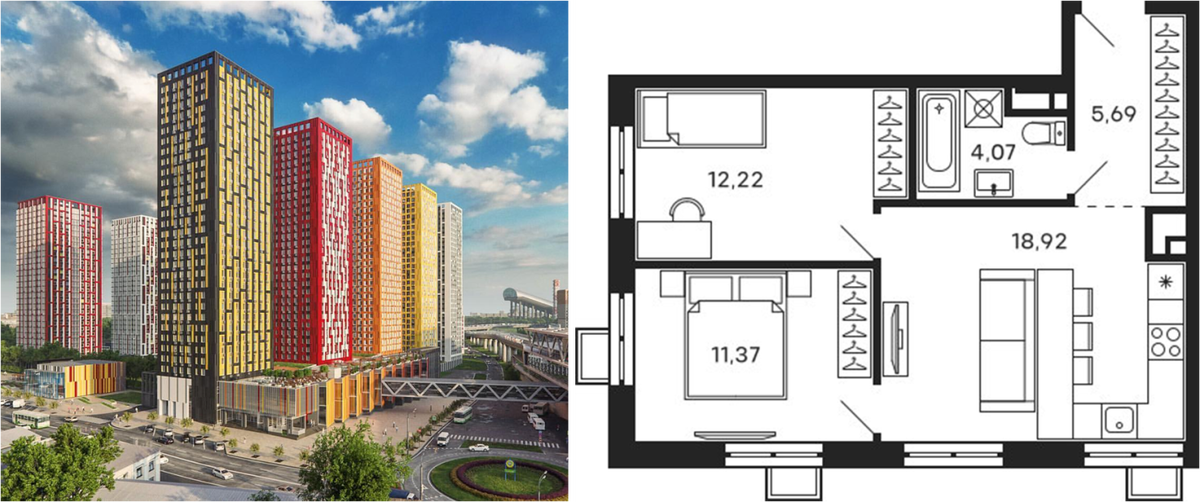 В Тетрисе (рядом с Красногорском) нашли евро-2, 40 м² без отделки, с ключами в 2026 году за 13,8 млн ₽, при средней цене на аналогичные квартиры в этом ЖК – от 15,3 млн. Разница – почти 1,5 млн рублей. Для рынка с уже высокой стадией готовности это аномалия. Застройщик распродавал пул с дисконтом. Транспортная доступность очень понравилась – до станции МЦД Павшино буквально пара минут. Аренда готовых евро-2 в этом ЖК приносит 60-70 тыс., и спрос довольно активный. Это явный фаворит в нашей подборке. До центра Москвы всего 45 минут. Западное направление – в 9 из 10 запросов клиенты просят именно его. К тому же здесь не стройка в поле, а сформированная среда: готовый район, собственный ТЦ, кинотеатр, школа, детский сад, парк, хорошая экология. Всё, что нужно для семьи.