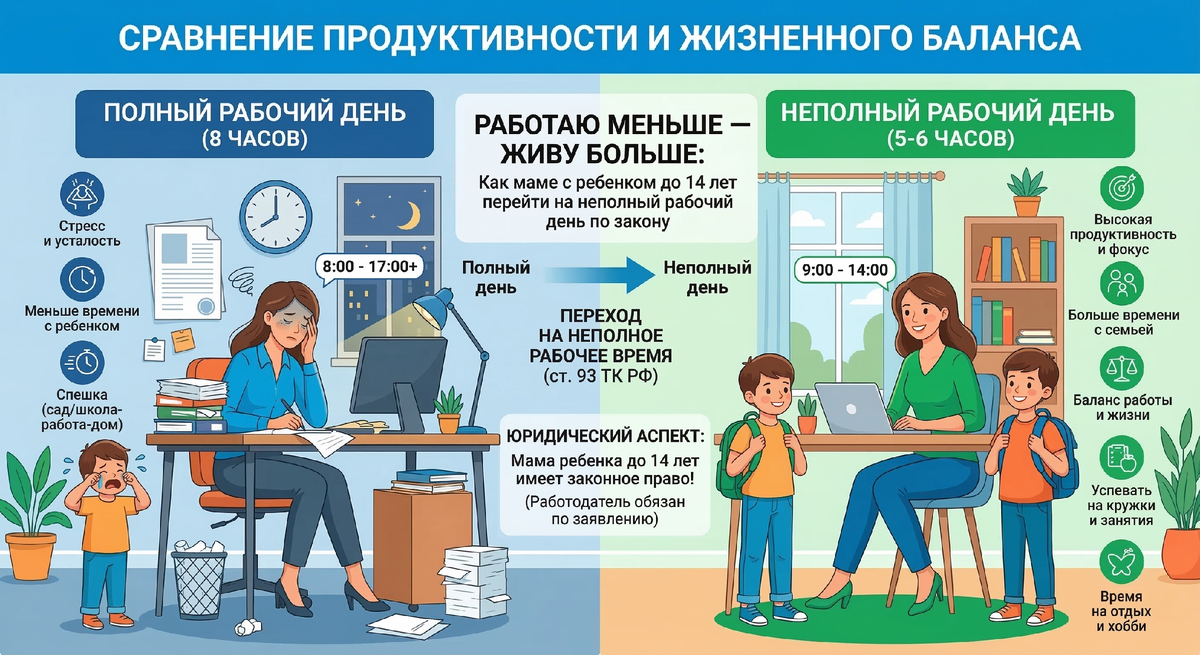 Вы мама, и вам хочется чуть больше времени на семью, хобби или просто на отдых? Хорошая новость: по закону вы имеете право работать меньше — и работодатель не может вам отказать, если вашему ребёнку ещё нет 14 лет.