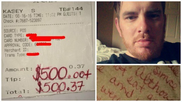 Официант одного из многочисленных кафе в США получил чаевые в 500 долларов при сумме заказа в 37 центов. Всё объяснила запись, оставленная посетительницей на салфетке. 32-летний официант Кейси Симмонс был на смене, посетители заказали самую дешевую позицию из меню – сладкую воду. Но на чай Кейси получил 500 долларов – как выяснилось, их оставила дочь старушки, которой накануне помог молодой человек. За день до этого Симмонс зашёл в местный супермаркет за продуктами. В очереди на кассе он заметил пожилую женщину, которая явно выглядела растерянной. Другие покупатели просто проходили мимо, но Симмонс подошёл к женщине и спросил, чем она расстроена и нужна ли ей помощь. Пожилая дама не стала ничего объяснять, но молодой человек все равно решил помочь и оплатил её продукты. – Они стоили всего 17 долларов, дело было не в деньгах. Дело в том, чтобы показать, что тебе не всё равно, – объясняет парень. Как написала в записке девушка, в тот день была третья годовщина смерти её отца, мужа той са