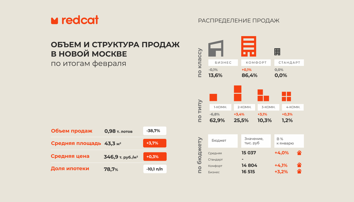 В Новой Москве в феврале спрос также, как и в старых границах продолжил свое падение, и обновил минимальные значения с момента разгара ковида – апреля-мая 2020 года. По итогам месяца в Новой Москве было продано менее тысячи лотов - 979 квартир и апартаментов, что на 38,7% меньше, чем в январе, если сравнивать текущие показатели с прошлым годом, то февраль этого показал результаты на 54,9% слабее. В течение месяца спрос равномерно сокращался во всех сегментах, новостройки комфорт-класса потеряли 38,7% сделок, а бизнес-сегмент – 39,0%. Так 86,4% (+0,1п/п) всех сделок в Новой Москве приходится на новостройки комфорт-класса, доля бизнес-сегмента, снизилась на 0,1 п/п до 13,6%. Что касается структуры по количеству комнат, то здесь, самое значительное сокращение показали одно и двухкомнатные лоты, количество сделок с ними сократилось на 44,7% и 29,2%. По итогам месяца доля однокомнатных квартир и студий сократилась на 6,8 п/п до уровня 62,9%. Доля 2-комн. лотов выросла на 3,4 п/п и состави