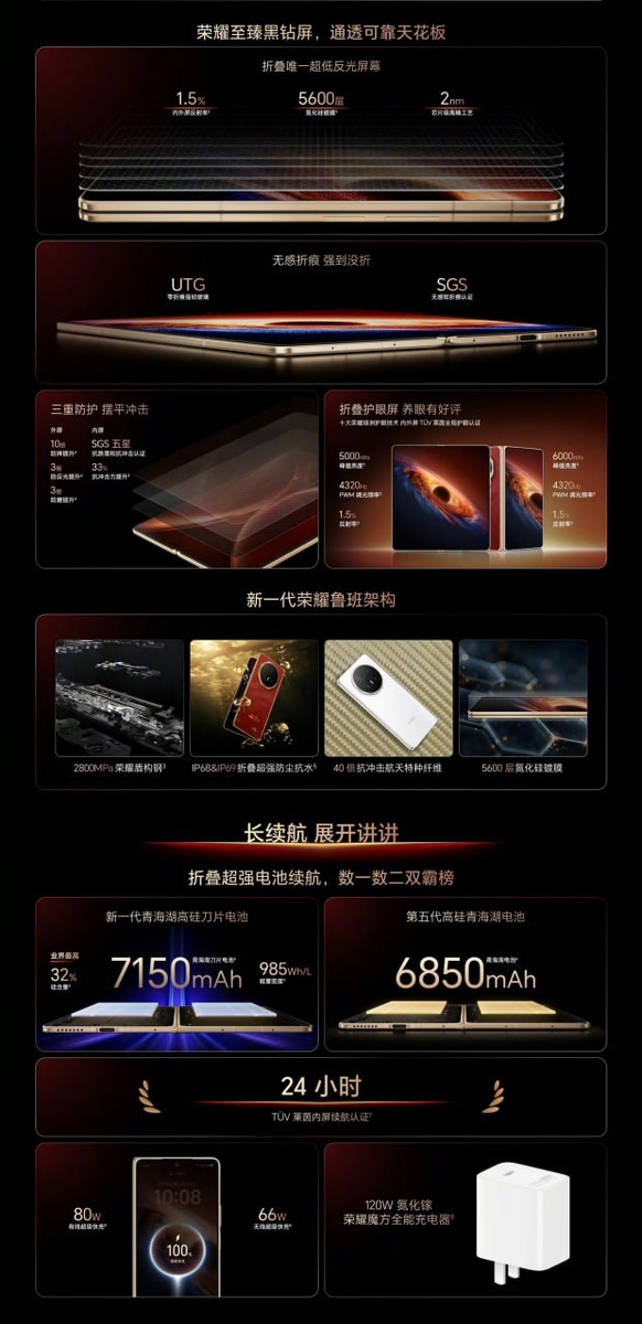! Honor вчера представил свою новую раскладушку — Magic V6, которую на MWC уже пощупал Фил. Глядя на параметры, кажется, что обновление относительно Magic V5 вышло минорное и было, чтоб обновить начинку. Аппарат получил Snapdragon 8 Elite Gen 5, но не настолько полноценный. То ожидаемый 17-го марта Oppo Find N6 основан на 7-ядерной версии этого «Дракона». Сколько ядер в Magic V6 не знаю, зато известно, что там есть чипы Honor C1+(улучшает связь) и Honor E2(оптимизирует питание), которые были в серии Magic 7. Памяти тут от 12/256 Гб до 16/1024 Гб LPDDR5X/UFS 4.1. Но главной фишкой явно стала батарея, чью ёмкость довели до 7150 мАч, а зарядку до 80 Вт, и это в корпусе около 4 мм в открытом виде. Правда, такая батарея лишь в топовом варианте с терабайтом памяти, в остальных версиях 6850 мАч, что не сильно меньше. 6.52”/7.95” (2420×1080p/2352×2172p, 1-120 Гц, ШИМ 4320 Гц, пиковая яркость 6000/5000 нит) внешний и внутренний OLED дисплей BOE вроде и не изменились. Правда, гарнир они прока