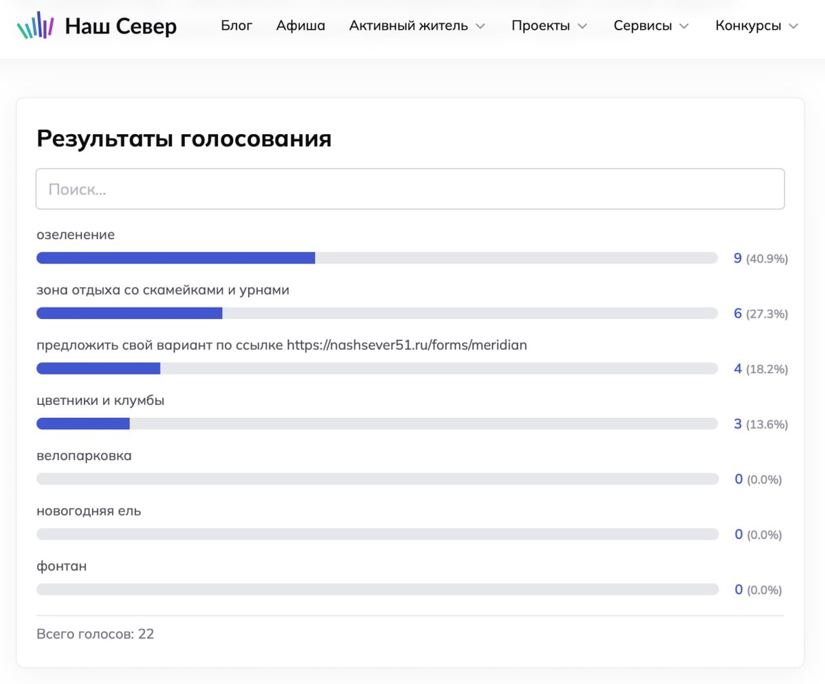 Портал «Наш Север» предлагает посетителям выбрать элементы благоустройства, которые должны быть на площади у гостиницы «Меридиан». Выбор невелик: озеленение, зона отдыха со скамейками и урнами, цветники и клумбы, велопарковка, новогодняя ель и фонтан. Ещё предлагается написать свой вариант. нА момент подготовки публикации проголосовало 22 человека и сегодня – последний день, когда можно отдать голос (само голосование запущено 6 марта). А чтобы выбрали вы? ❄ «Арктический Обозреватель»