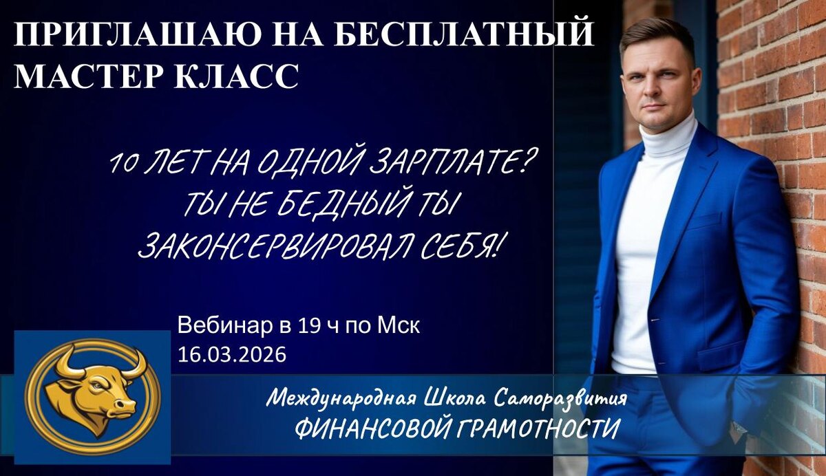 Приглашаем вас на бесплатный мастер класс, посвящённый теме: 10 ЛЕТ НА ОДНОЙ ЗАРПЛАТЕ? ТЫ НЕ БЕДНЫЙ. ТЫ ЗАКОНСЕРВИРОВАЛ СВОЮ НИЩЕТУ. Посчитай сам. 10 лет назад ты получал 30 тысяч. Сейчас — 80. Цены выросли в 3 раза. Инфляция сожрала твои сбережения, если они были. А если не было — сожрала твою жизнь. Ты работаешь больше, а живешь хуже. Кредиты жрут половину зарплаты. Отложить — смешно. Пенсия? Какая пенсия, если ты сейчас еле сводишь концы? Денег не хватает не на что. О какой безопасности может идти речь? Находимся в постоянном дефиците всего. Что делать? И самое страшное — ты привык. Смирился. Думаешь: "все так живут". Врут. Не все так живут... Есть те, кто 10 лет назад был таким же, как ты. А сегодня у них квартиры, пассивный доход и пофиг на курс доллара. Они не умнее. Они просто увидели дверь, в которую надо войти. Ты стоишь перед той же дверью. Но боишься. Или не знаешь, с какой стороны открывается. 16 марта в 19:00 МСК я проведу бесплатный мастер-класс для тех, кто устал. Тема: