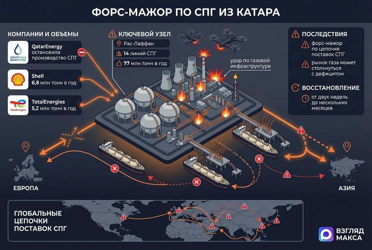 поставкам сжиженного природного газа из Катара. Об этом сообщает Reuters со ссылкой на источники. Таким образом, последствия удара по катарской газовой инфраструктуре начали быстро расходиться по всей цепочке мировых поставок СПГ. Как следует из публикации, причиной стало решение самой QatarEnergy приостановить производство СПГ и сопутствующей продукции после атаки на её промышленные объекты в Рас-Лаффане и Месаиде. Национальная компания уведомила своих клиентов о наступлении обстоятельств непреодолимой силы, а те, в свою очередь, начали транслировать этот режим дальше — уже своим покупателям. По данным Минобороны Катара, объекты QatarEnergy подверглись ударам беспилотников, запущенных с территории Ирана. Ещё 3 марта корпорация объявила о временной остановке производства ряда продуктов переработки, включая карбамид, полимеры, метанол, алюминий и другие позиции. Теперь последствия затронули и основное газовое направление. Shell и TotalEnergies занимают в катарской газовой отрасли важ