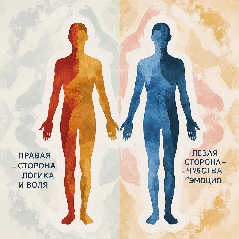 Вы замечали, что боль часто появляется с какой-то одной стороны? Но в психосоматике это редко считается случайностью. Есть интересная символика. Левая сторона тела связана с: — матерью — прошлым — эмоциями — способностью принимать — внутренним миром Правая сторона чаще отражает: — отца — будущее — действия и реализацию — ответственность — способность отдавать И иногда это очень точно ложится на жизненные истории. Например. У человека долго болит левое плечо. В разговоре выясняется: много обид на маму, сложные отношения в семье, ощущение, что любви в детстве не хватило. Левая сторона — про принятие. И именно там тело «держит» напряжение. Или другая ситуация. Человек перегружен работой, постоянно должен соответствовать ожиданиям, боится подвести. Начинает болеть правая рука или правая сторона шеи — сторона действий, ответственности и давления будущего. Иногда тело буквально показывает, где нарушился баланс. Потому что для здоровья нам нужно и то, и другое: -уметь принимать и уметь отд