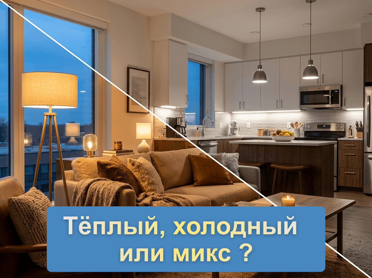 Многие думают, что для всей квартиры нужно выбрать одну температуру света. Но секрет уютных и функциональных интерьеров кроется именно в сценариях освещения. Можно ли смешивать тёплый и холодный свет? Да! Но делать это нужно по правилам, чтобы не получить эффект «больничной палаты» или «грязного» пятна на потолке. 💡 1. Разбираемся в оттенках света 📝2700К – 3500К (Тёплый): уют, расслабление, вечер. Идеален для дерева, текстиля, кожи. Даёт мягкое «домашнее» свечение. 📝3500К – 5000К (Нейтральный): бодрость, концентрация. Подходит для рабочих зон, кухни, ванной у зеркала. Свет чистый, но не резкий. 📝5000К+ (Холодный): В жилых помещениях лучше не использовать! Ассоциируется с операционной или офисом. 🏠 2. Правило зонирования ✅Свет должен подстраиваться под функцию зоны, а не под цвет обоев. ✅Кухня: над обеденным столом – тёплый свет, над рабочей поверхностью – нейтральный свет. ✅В гостиной: основной свет — тёплый, торшер для чтения — нейтральный. ⚠ 3. Главные ошибки при смешивании ❌ Со