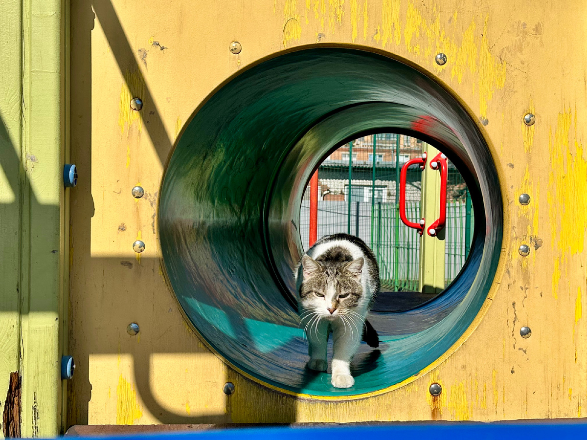 На детской площадке из трубы ко мне подходит кот ленивой и важной походкой.