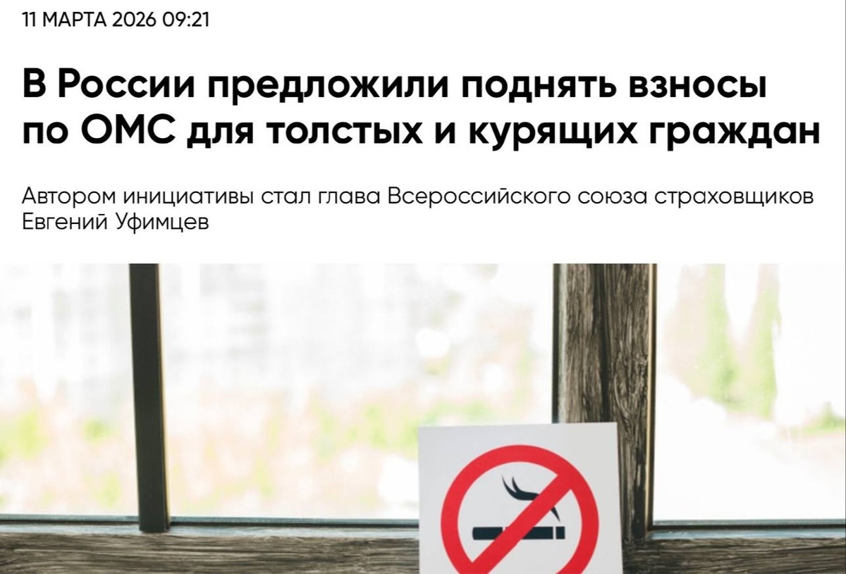 Глава союза страховщиков Евгений Уфимцев выступил с инициативой ввести повышающие коэффициенты по ОМС для курильщиков и людей с избыточным весом. По мнению Уфимцева, те, кто пренебрегает здоровым образом жизни, должны платить за медицинское страхование больше. «Куришь или набираешь лишний вес — применяем коэффициент 2 или 3. В конечном счёте всё упирается в деньги», — пояснил он.