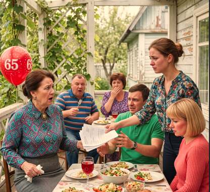 Дача Надежды Степановны гудела. На просторной веранде стоял длинный стол, уставленный тарелками с нарезкой и маринованными огурцами. Дядя Игорь, краснолицый и шумный, уже разливал по рюмкам крепкие напитки. Свекровь, в нарядной блузке с брошью, царственно принимала цветы.