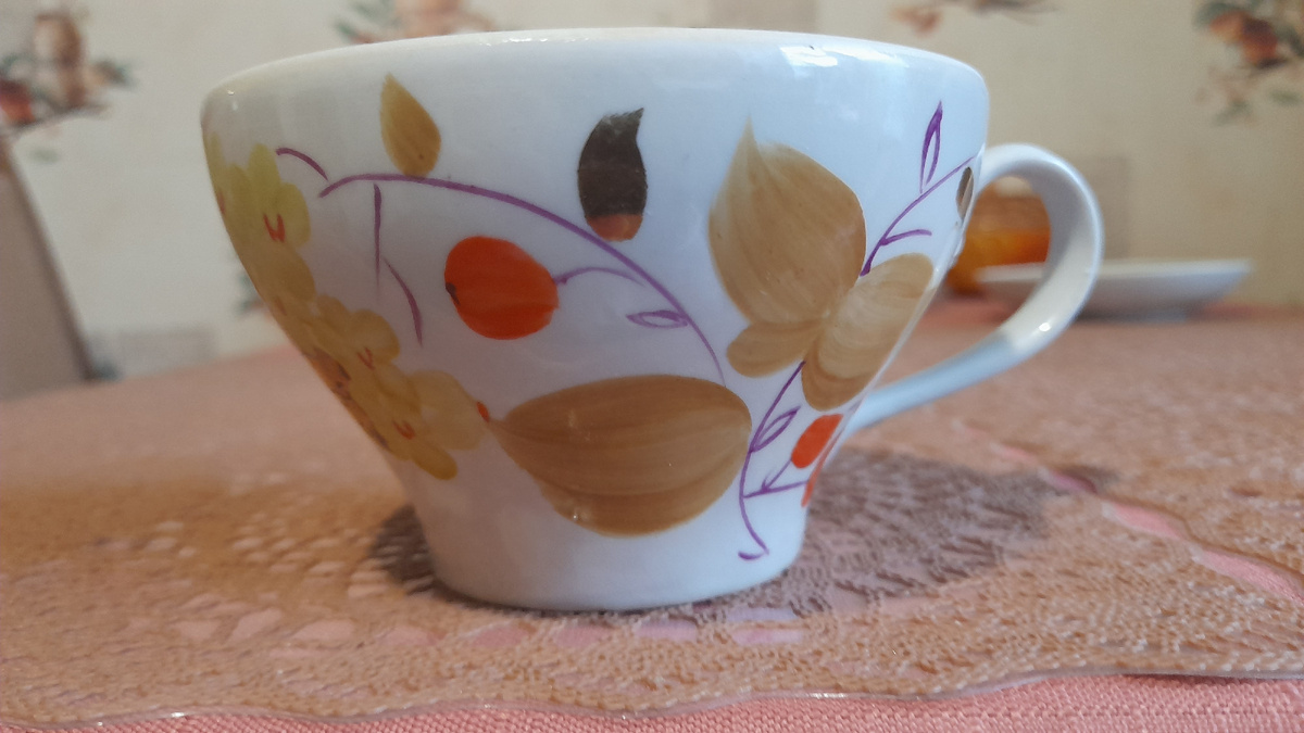 Первая публикация у меня была посвящена вот этой горячо мной любимой чашке производства Южноуральского фарфорового завода. Не такой-то она и винтаж, это клеймо ставилось с 1992 по 2002 год. Но, как я уже писала, мне нравится в ней всё: и форма, и объём, и удобная ручка, а самое главное - очень красивая ручная роспись. Досталась она мне без блюдца, блюдце я ей подобрала простое белое с золотой отводкой этого же завода. Очень хотелось узнать о ней хоть что-нибудь. Как называется форма и роспись, кто автор, как выглядит блюдце и т.п. Но нигде не нашла никаких сведений, и не встречала ничего с этой росписью, кроме чайника, который тоже сразу приобрела. И вот, наконец, спустя 2 года встречаю на Авито вот это объявление. Продавец, кстати, из Южноуральска. Преподносилось это, как чайная пара, но я то видела, что это не блюдца, а десертные тарелочки. Но всё-равно, приобрела одну такую пару в компанию к моей любимице. Продавца спросила про блюдца. Он послал мне фотографию. Блюдца простые, как
