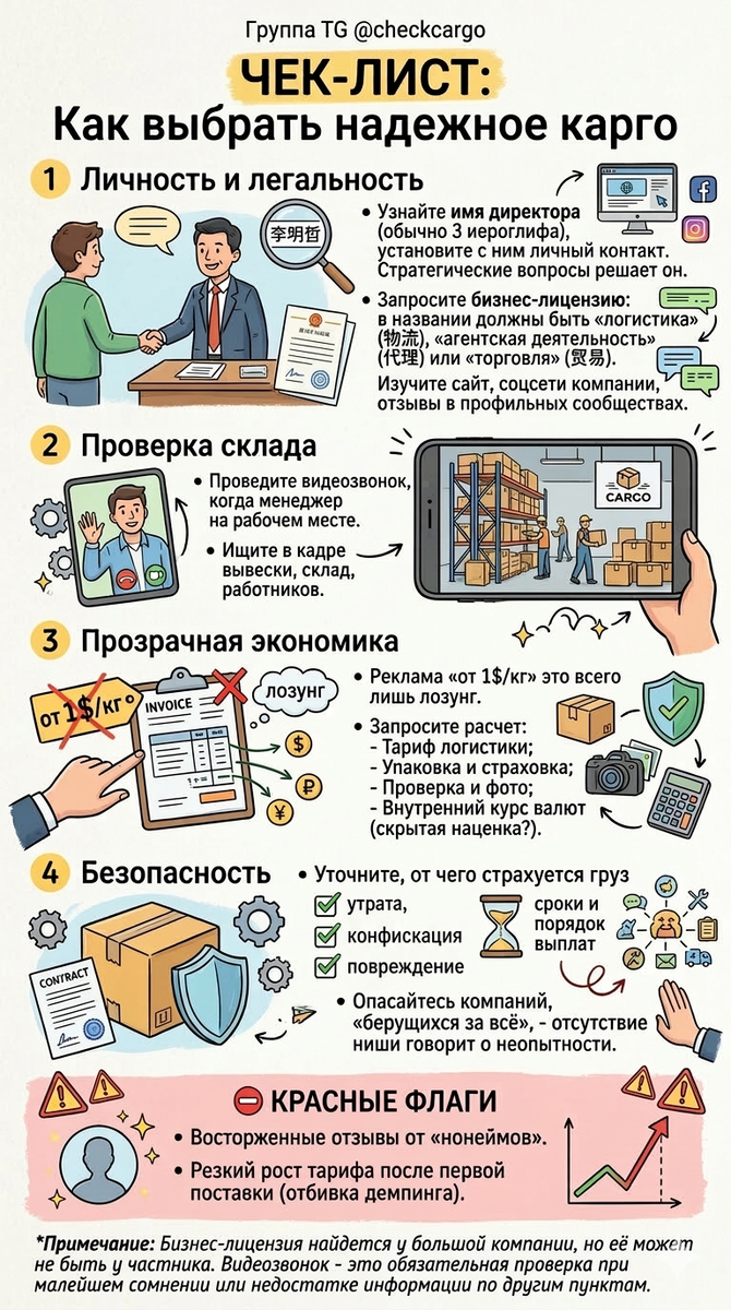 Здравствуйте, дорогие читатели моего блога. На связи Дмитрий. Сегодня пост о том, как выбрать надежное карго из Китая. Карго из Китая - распространенный способ доставки товаров из Китая, которым пользуются начинающие предприниматели и обычные пользователи китайских маркетплейсов. Карго удобно тем, что позволяет импортировать небольшие оптовые партии. Но документов для бухгалтерии, налоговой и таможни вы при этом не получите. Рынок карго очень большой, конкурентный, с очень не высоким порогом входа. Достаточно арендовать небольшой склад и сделать объявление с заниженными ценами с целью привлечь клиентов. При этом карго очень рискованный способ доставки, случаются конфискации, повреждения, утери. Многое зависит от того, как работает конкретная карго-компания. Хорошо ли упаковывает, проверяет ли товар, удаляет ли лишнюю упаковку и т.д. Поэтому к выбору карго необходимо подходить тщательно. Я подготовил для вас вот такой чек-лист для выбора надежного карго: ✅ Личность и легальность Ко