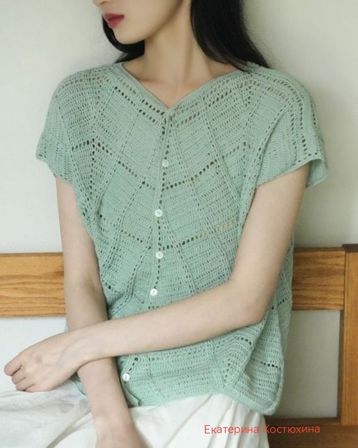 Рассмотрим симпатичную блузку крючком. Схемы тоже прикрепляю.