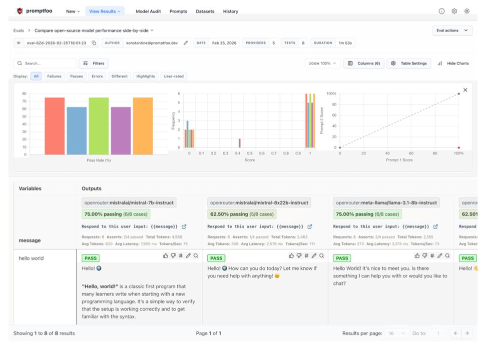 Главная ценность Promptfoo — превращение «регулировки промптов и ручной проверки» в инженерно управляемый процесс. Их система позволяет автоматизировать оценку моделей, проводить red‑team‑тестирование (моделирование атак и вредоносных сценариев) и интегрировать проверки в CI/CD, что делает тестирование LLM‑продуктов сопоставимым со стандартными практиками разработки ПО.