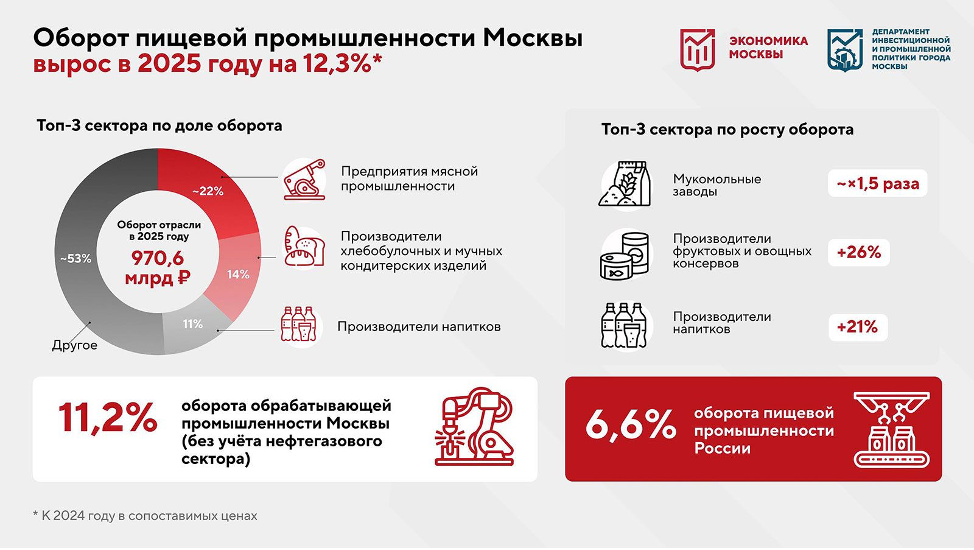 В 2025 году оборот пищевой промышленности Москвы вырос на 12,3 % в сопоставимых ценах. Столичные предприятия выпускают практически все основные группы продуктов — молочные, мясные, хлебобулочные, рыбные, кондитерские изделия, напитки и детское питание — и обеспечивают ими не только москвичей, но и другие регионы страны. Наибольший рост показали мукомольные заводы — их выручка увеличилась почти в полтора раза и достигла 24,7 миллиарда рублей. Основную долю в общем объёме занимают мясная промышленность, производство хлебобулочных и мучных кондитерских изделий, а также напитков. Пищевая отрасль — одно из ключевых направлений столичной промышленности. В Москве работают более 350 предприятий, которым доступно свыше 20 мер поддержки: компенсация процентов по инвестиционным кредитам, льготная аренда земли для новых производств и другие инструменты. Город участвует в создании первой очереди пищевого кластера в ТиНАО и в прошлом году открыл первый профильный пищевой технопарк на западе столицы.
