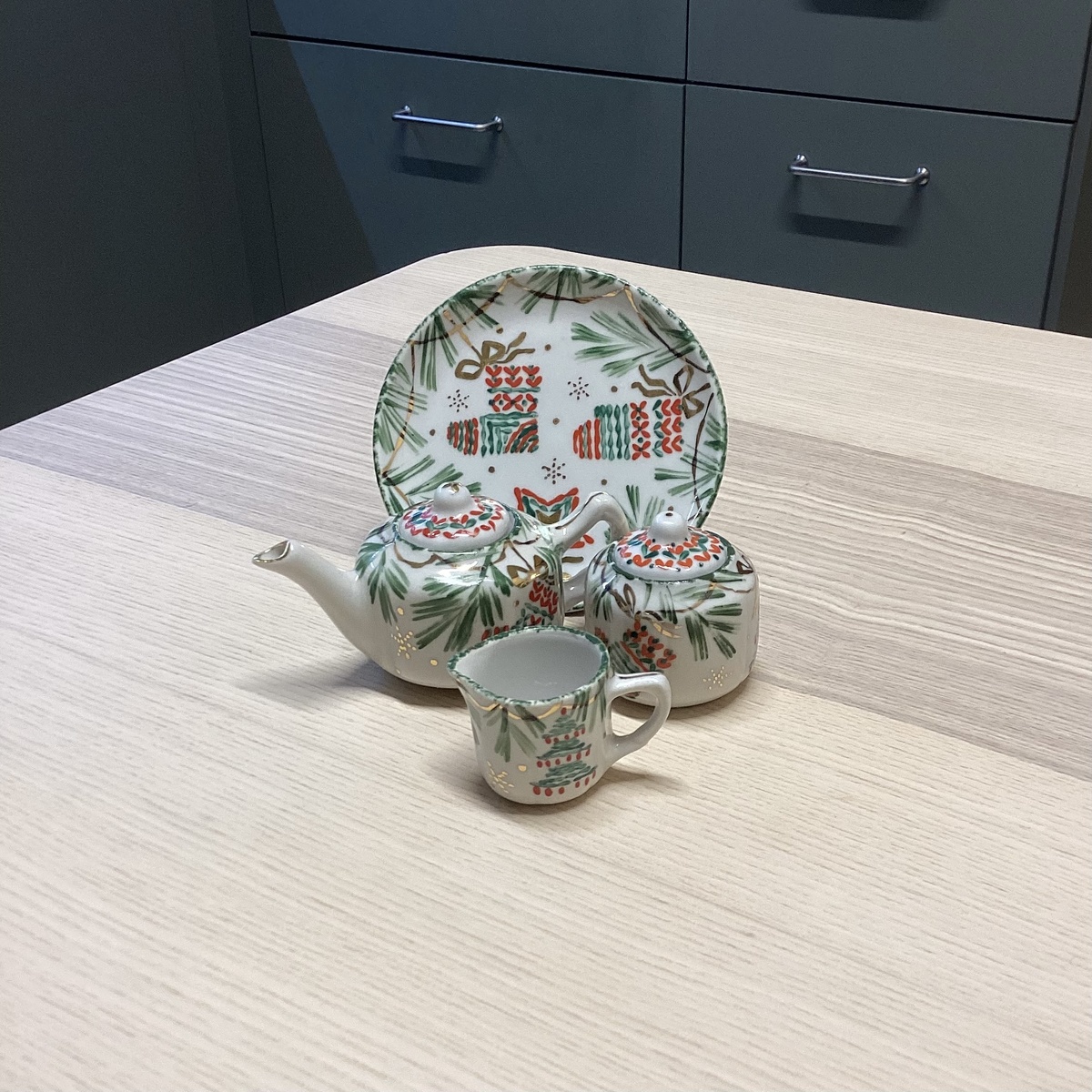 Был удивлён, увидев у Дулево детский сервиз на старой форме. Роспись живая, сочная, веселая, от нее так и веет Новым годом. Поэтому не долго думая, этот сервиз быстро попал ко мне в коллекцию. Где уже имеется один сервизик советского времени на такой же форме, но с простыми голубыми цветочками. Примерно такие же кукольные наборы видел и от М.С. Кузнецова, но конечно, они безумно редкие. Ведь это