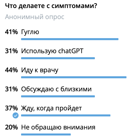 В своем ТГ-канале провела опрос среди подписчиков по поводу того, что они делают с телесными симптомами, которые у них время от времени появляются. Вот какие получились результаты: Первое, что бросается в глаза: 41% подписчиков гуглят симптомы, чуть реже используют ChatGPT. Весьма распространенной является идея при появлении непонятных ощущений сначала отправиться на сбор информации. Ну оно и понятно: быстро, удобно, бесплатно. Почему бы с этого не начать? И хорошо, если удастся убедиться, что с организмом либо все в порядке, либо неполадки являются незначительными. Но есть нюанс. Интернет почти всегда показывает самые тревожные сценарии. Поэтому вместо успокоения человек часто получает дополнительную порцию страха. Так формируется киберхондрия - бесконечный поиск симптомов, который только усиливает тревогу. Хорошая новость: 46% всё-таки идут к врачу! Это правильная стратегия. Вроде бы. Однако, при тревожных расстройствах часто происходит так: обследования показывают, что всё в порядке