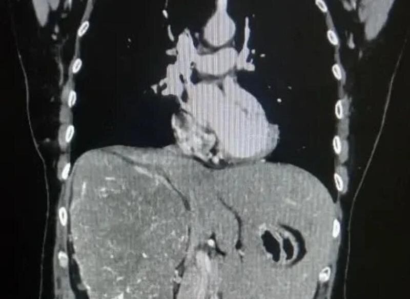 Женщина долгое время жаловалась на тупую боль в пояснице и чувство тяжести в животе. После обследования с помощью компьютерной томографии врачи обнаружили крупную опухоль, которая практически полностью заняла правую сторону брюшной полости. Исследования показали, что функция правой почки была почти полностью утрачена. Размер новообразования составил более 20 сантиметров. Медики приняли решение о проведении операции. Из-за больших размеров опухоли выполнить вмешательство малоинвазивным способом было невозможно, поэтому хирурги провели открытую операцию — радикальное удаление правой почки.