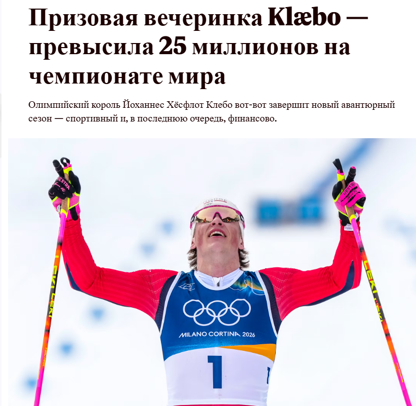 После двух новых побед с сопутствующими призовыми чеками в Лахти на прошлых выходных, Клебо собрал 2,235 миллиона евро только на Кубке мира. Это соответствует чуть менее 25 миллионов норвежских крон по сегодняшнему курсу.