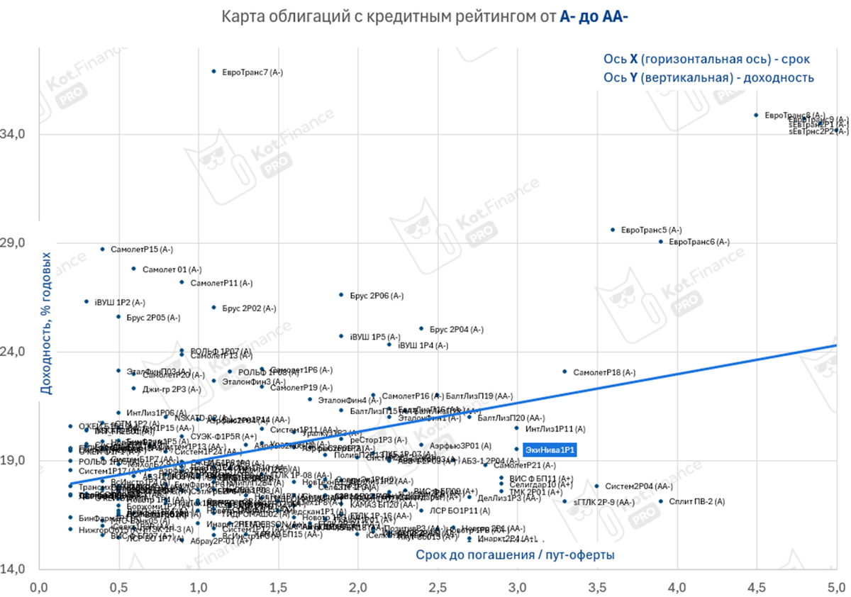 На размещении 2 выпуска: фикс на 3 года и флоатер на 2. Есть ли апсайд? Стоит ли покупать? О выпусках • ЭкоНива 1Р1 и ЭкоНива 1Р2 • Купон: 18% ежемесячно / КС+4% ежемесячно • Доходность: до 19,5% для фикс и 21,1% для флоатера при неизменности КС ❗️Если ждать КС 13% к концу 2026 года и ~10% к концу 2027, то эффективная доходность составит ~18,3% годовых. Расчет смотри в конце поста 👇 • Амортизация: - • Срок: 3 года для фикс, 2 года для флоатера • Объем: ₽5 млрд • Рейтинг: А+ (АКРА), А (Эксперт РА) ❓ Как связан рейтинг и дефолт? Подготовлено с помощью 🗺интерактивной карты 👍Плюсы + дебютное размещение, предполагающее премию + лидер в молочном животноводстве в отрасли с длительным производственным циклом – появление новых крупных конкурентов затратно и маловероятно ❗️Риски - из-за быстрого роста в долг, ГК ЭкоНива переживала несколько реструктуризаций как кредитных обязательств, так и облигационных займов (номинированных и торгующихся в евро на европейской бирже). См. инфо о Ekosem Agra