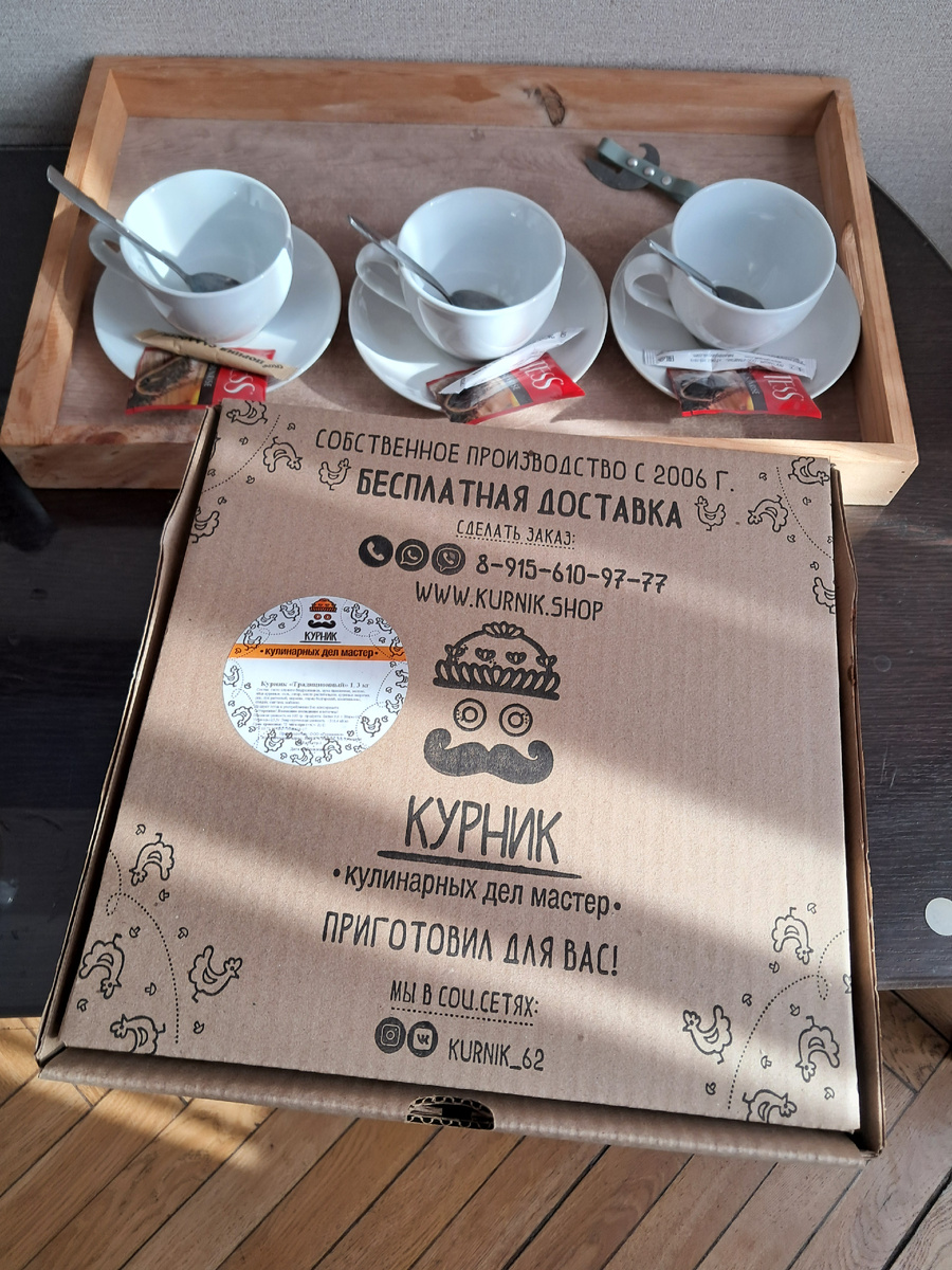 Начнем с Рязанского Курника Традиционного. Это русский пирог куполообразной формы с начинкой из курятины, грибов, риса, овощей и блинов, сверху пирог украшается различными узорами. Существует версия, что своим названием курник обязан выходящему, как бы «курящемуся», при приготовлении в верхнем отверстии пару. Настоящее распространение курник получил в XVI–XVII веках, когда превратился в неотъемлемую часть торжественных трапез. Особенно он прославился как «царский пирог», потому что подавался на свадьбах представителей высшей знати. Сегодня курник остается одним из символов русской кухни. Его готовят на праздники и семейные торжества, сохраняя традиции предков. Современные кулинары продолжают экспериментировать с рецептом, добавляя новые ингредиенты и способы приготовления. Однако суть остается неизменной: курник – это праздник вкуса и гармонии, объединяющий людей за столом. Его, как оказалось, не так просто найти! Мы обзвонили несколько заведений где по информации из интернета делают Курник....в одном про него ничего не знали, в другом его в этот день не готовили, третий ресторан был закрыт после праздничных дней, четвертый находился далековато от центра города (в Солотче) и только в пятом месте согласились приготовить для нас этот пирог и то не сразу! Дело в том что в пекарне "Курник" пироги пекут по предварительному заказу который надо успеть сделать до 12 часов дня и только пирог Курник Традиционный можно заказать до 16 часов дня (об этом сказано у них на сайте)! Вобщем, объяснив это оператору, нам дали добро на заказ в 13 часов дня и привезли этот вкусный пирог в течении двух часов после заказа. Доставка у них бесплатная. В пекарне есть скидка 10% на День рождения, скидка 5% за самовывоз и другие скидки и акции, подробнее узнайте по ссылке.