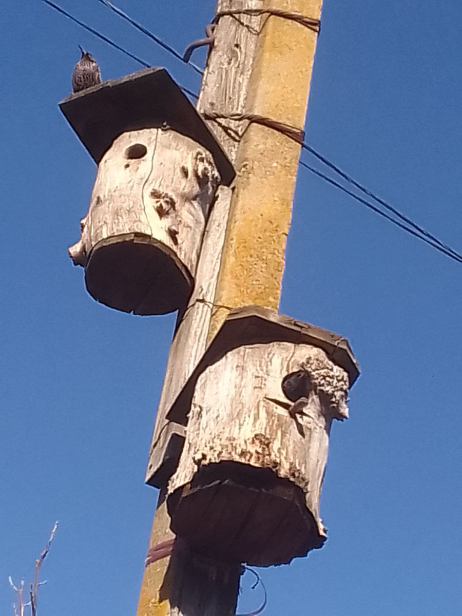 Весна у меня начинается с прилетом скворцов. Бывает, прилетают рано, как в этом году. Может, они и не улетали? Или очень соскучились, и прилетели пораньше обычного. На железобетонном столбе у меня три скворечни. Места хватает, мне не жалко, пусть будет большая птичья многоэтажка. Сначала, лет двадцать пять тому, закрепил первый скворечник на самом верху столба. Попросил у электриков столбоходы, (такие приспособления, по электроопорам, т.е. столбам ходить), забрался, прикрепил, пусть селятся, живут нам на радость. Дети увидели, как поют скворцы, как они заселяются, как оберегают свое жилье, интересно за ними наблюдать, захотелось, чтоб было больше. Изготовили из прогнившего внутри клена еще два гнезда – дуплянки. Это просто, внутри все пусто, только дно и крышу доделать, вход просверлить, и все. Но забираться высоко уже не хотелось. Хоть птицам это и лучше, безопасней. Поленился высоко карабкаться. Но и так получилось, как бы и неплохо. Они привыкают ко мне, думаю, что узнают и в лицо,